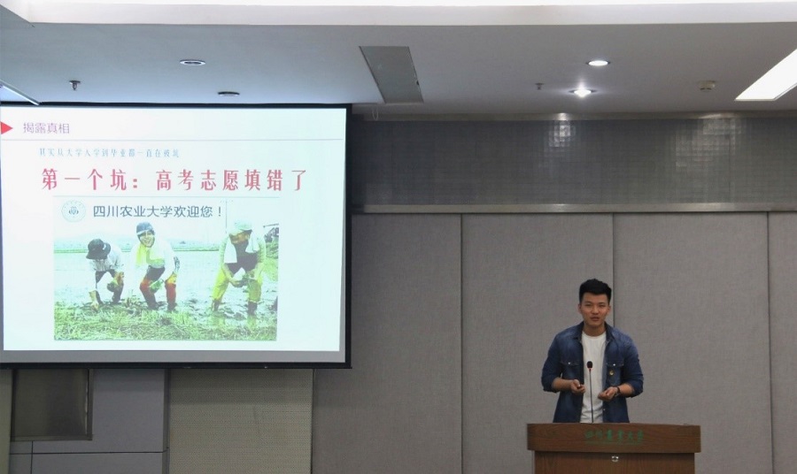 “创青春”全国金奖得主,来自动物科技学院的“新青年”肖军森,以“创业新手走过的N个坑”为题,用幽默风趣的方式给大家分享了他的创业经历。从高考志愿填错、创业概念理解错、创业项目选择错误、创业伙伴选择错误到创业战略选择错误,他说虽然有这么多个坑,但是都经历过来后就成为了自己成功的垫脚石。当被问到是选择一份稳定的工作好还是选择创业好,他说:“无论是创业还是工作,没有好坏,这是每一个人的选择。只要选择了一条路,然后认真努力为之奋斗便可以成功。”