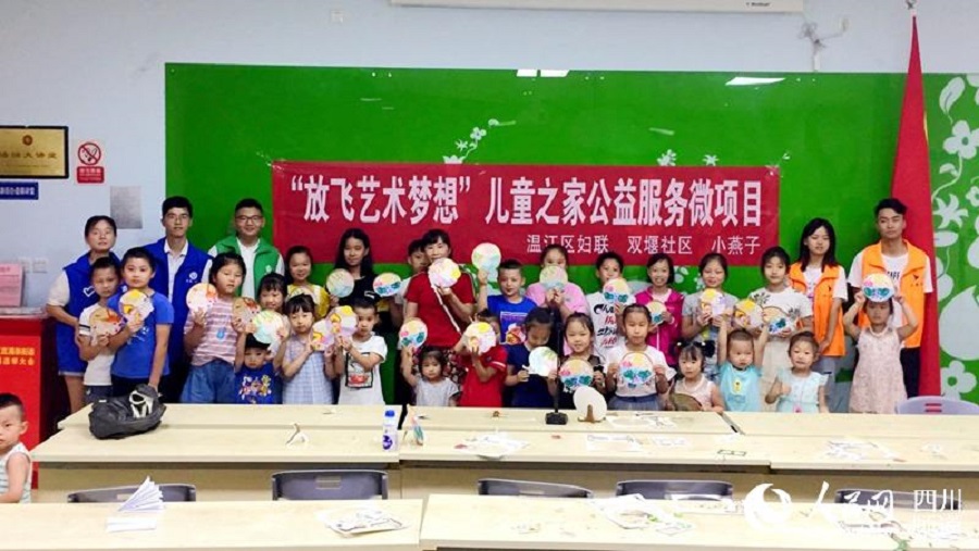 除了组织夏令营外,大学生们还协助社区开展了“放飞艺术梦想”儿童之家公益服务微项目。“鹅鹅鹅,曲项向天歌,白毛浮绿水,红掌拨清波……”23个小朋友的读书声汇在一起,仿佛一曲乐章,十分的动听。在志愿者们领着孩子们一起学习完国学经典《咏鹅》、《小池》、《出塞》和《送孟浩然之广陵》后,手工制作课正式开讲了。台上老师耐心地讲解,台下小朋友认真地学习、制作,志愿者们在一旁悉心指导。作品完成了,孩子们争着要和志愿者们拍照,笑得像一朵朵太阳花!