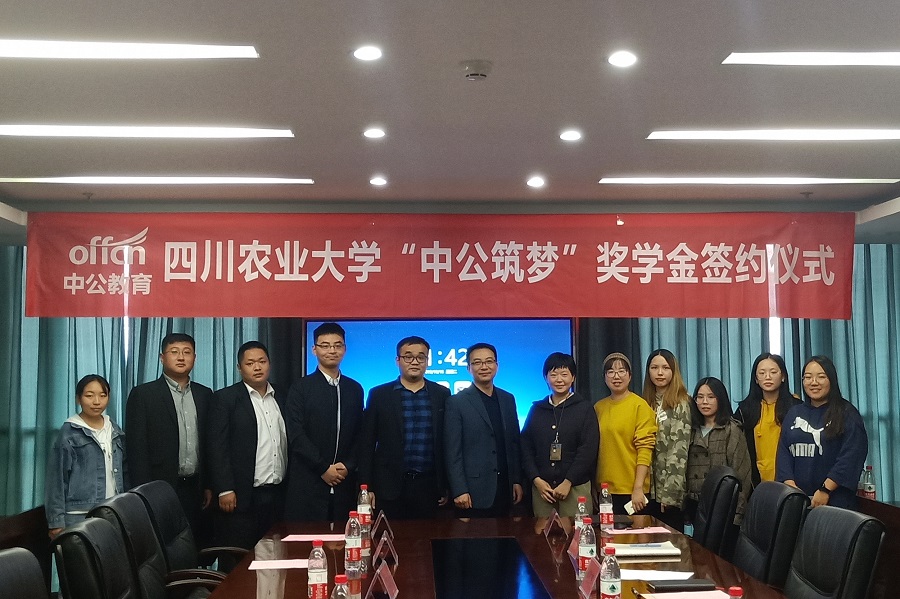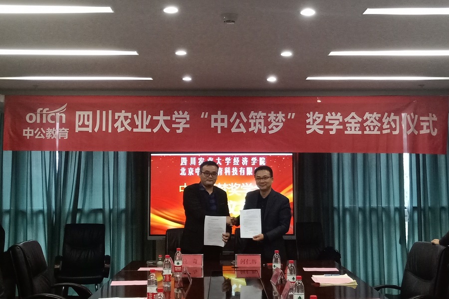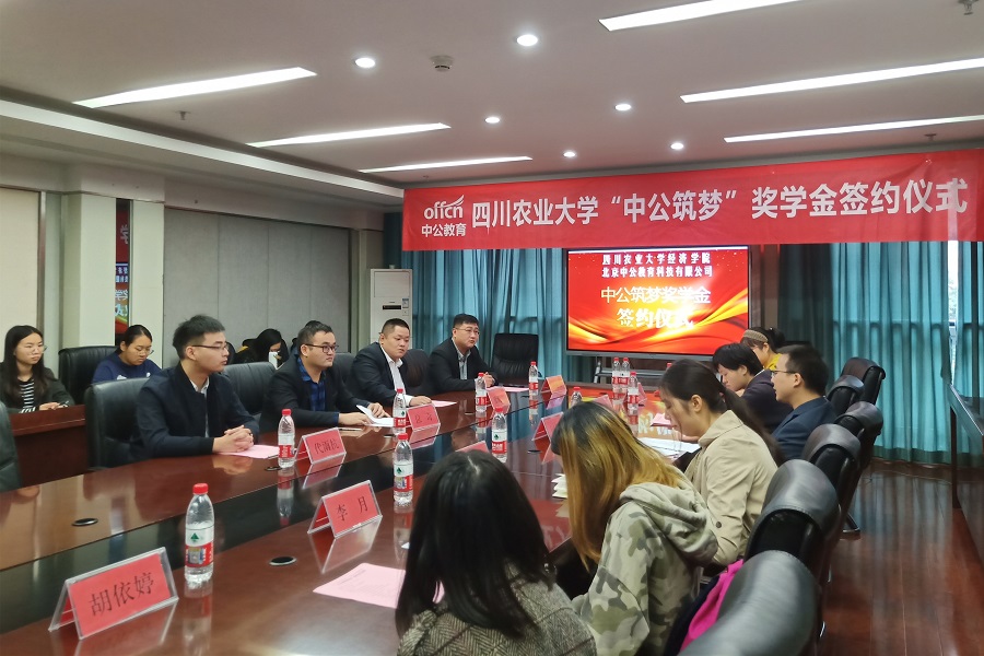 10月15日上午,经济学院与北京中公教育科技有限公司关于“中公筑梦奖学金”的签约仪式在一教305举行。中公教育省级副校长位奇、温江区校长徐海栗、考研项目部主管陈志宏一行,经济学院党委副书记何仁辉,团委书记、党委办公室副主任钟贝及学院辅导员老师、学生代表参加了签约仪式。
