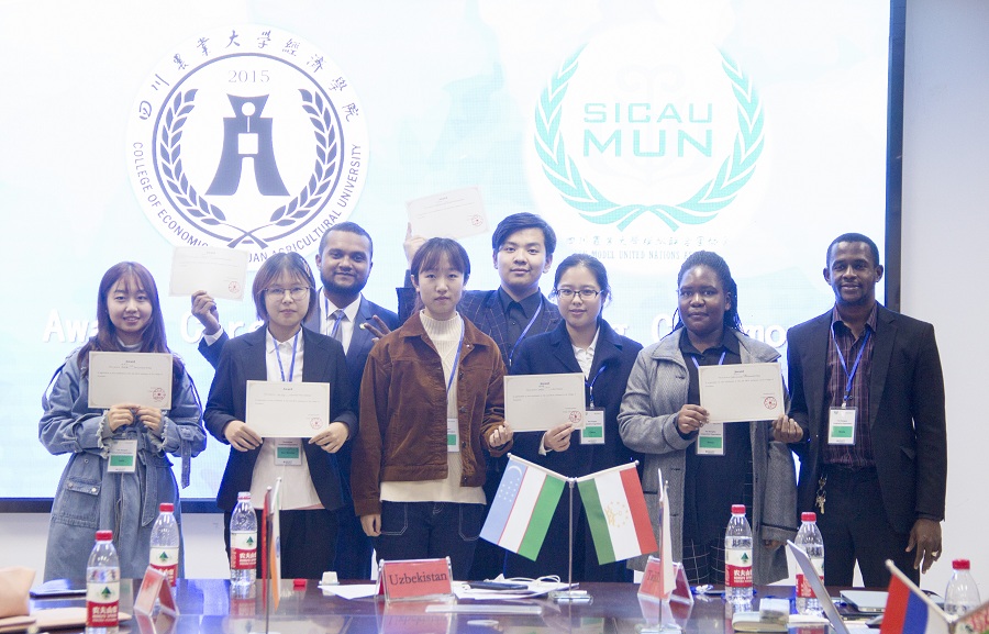 中国代表张雨竹和陈知菲获一等奖,陆正月和苏思怡获二等奖,美尼亚代表Mandakhnaran和乌兹别克斯坦代表Sk galib Hasan fahim分获“最佳推动代表”,印度代表邓婷云、李秋璇和俄罗斯代表YAYA SOW、Chibisa Vivienne Vimbai四人获“最佳文件写作代表”。