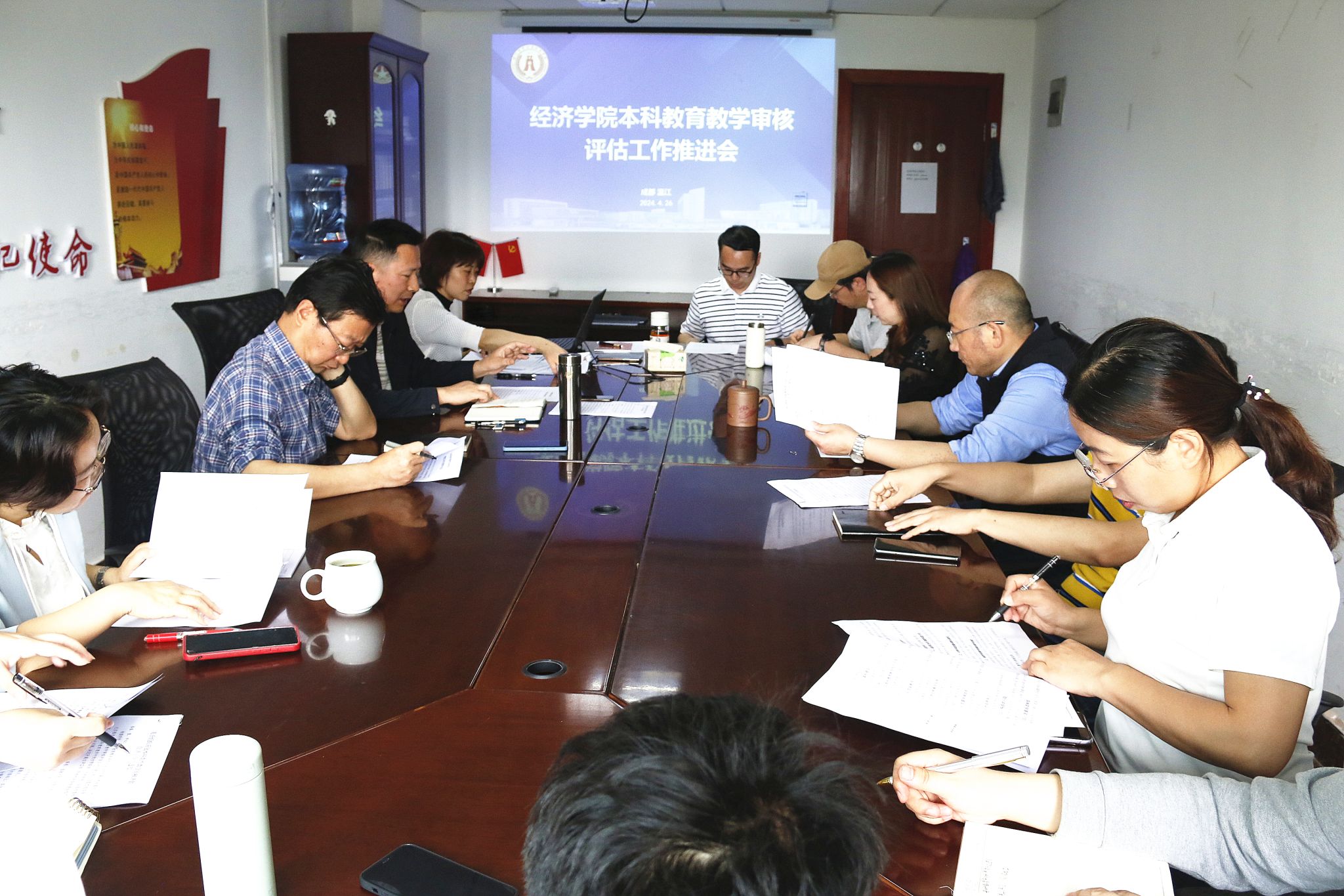 4月26日上午,经济学院在1教425会议室召开了本科教育教学审核评估工作推进会。学院院长曾维忠、副院长吴平、各系室中心负责人、教学督导组等全体评建工作组成员参加会议。