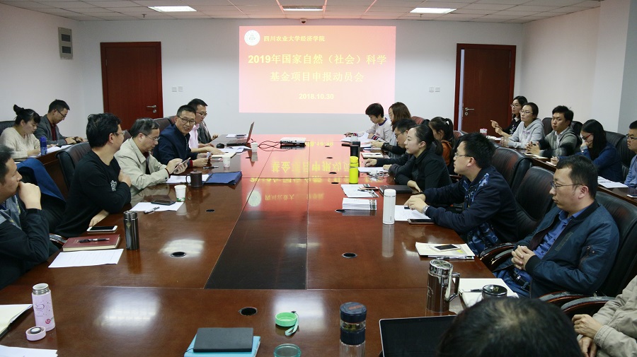 10月30日下午,经济学院召开2019年度国家自科(社科)基金项目申报工作动员会,对基金申报工作进行安排部署。科技处处长曾维忠、经济学院长蒋远胜、党委书记漆雁斌、党委副书记何仁辉、副院长吴平,各系室负责人、全体博士或副高级以上人员等近40人参加会议。党委书记漆雁斌主持会议。
