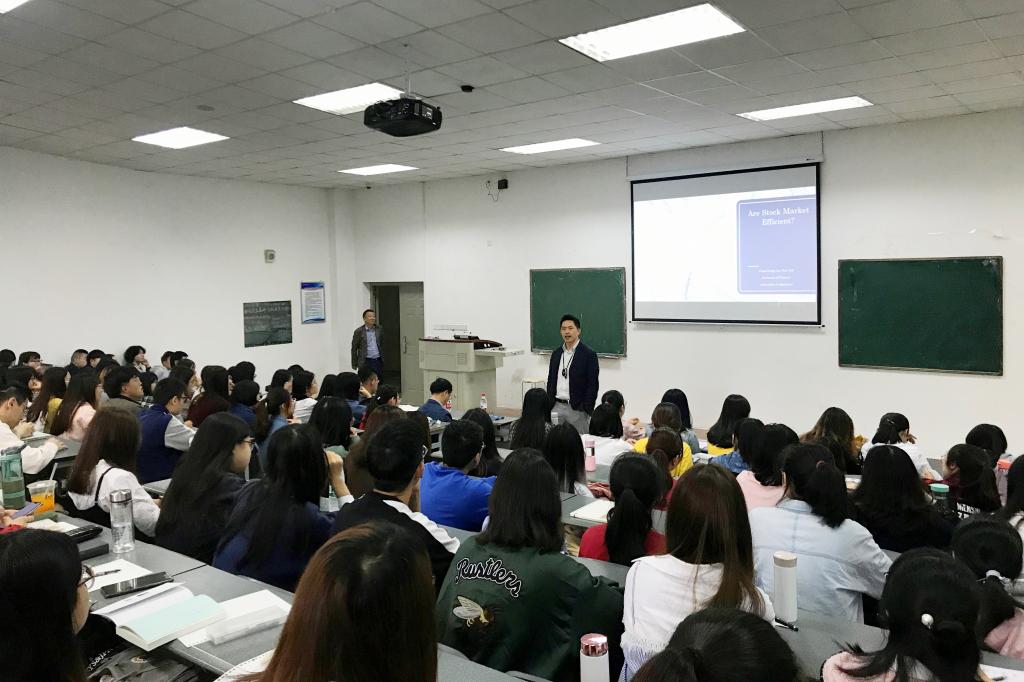下午,刘宏教授为经济学院师生做《The beauty of Economics and Finance》演讲报告。刘教授从案例入手,以“股票市场是否有效”为主题,深入浅出的介绍了行为金融学的经典理论和假说,从假设提出、数据收集、模型论证、研究结论及贡献等方面对股票市场的有效性进行了论证及学术分享。