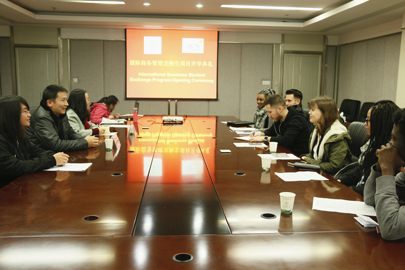 2017年3月8日下午,第四届中法“国际商务管理”交换生项目开学典礼在一教304会议室举行。经济学院副院长吴平,国际经济与贸易系主任沈倩岭,副系主任刘春梅以及14名法国交换生、志愿者代表参加开学典礼。