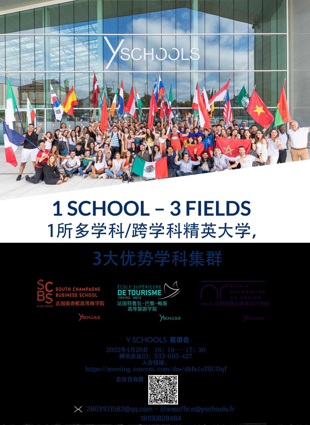 为拓宽我校同学国际视野,提供对外交流锻炼机会,我院定于2022年4月26日(星期二)16:10举行法国Y Schools精英高等院校联盟校际合作留学项目线上宣讲会,欢迎广大学生积极参加。