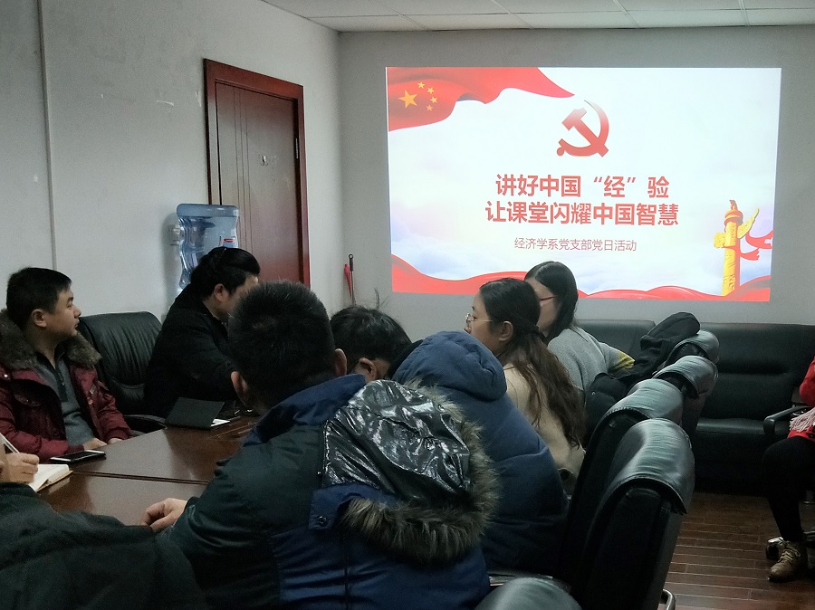 12月25日下午,经济学院经济学系教工党支部“讲好中国‘经’验,让课堂闪耀中国智慧”专题组织生活会在1教403会议室召开。学校党委书记庄天慧,学院党委副书记、纪委书记何仁辉以普通党员身份与全体支部成员一道参会。会议由党支部书记郑勇主持。