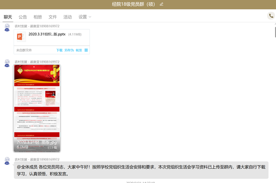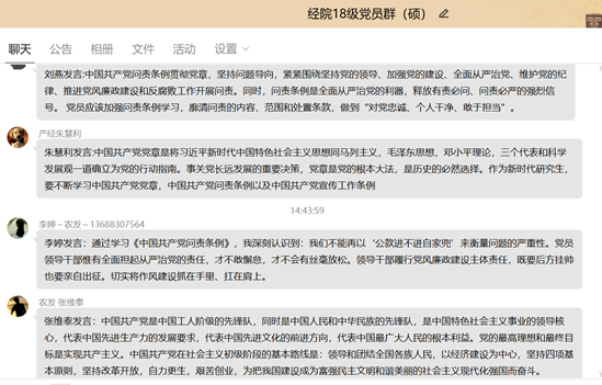 2020年4月14日中午2:30,经济学院2018级硕士研究生党支部在书记郝奥亚主持下,通过QQ在线召开组织生活会,共有25位党员和20位积极分子参加会议。