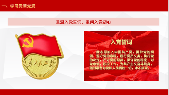 大会第二项,全体党员重温入党誓词,重问入党初心。永葆初心,不忘使命,时刻提醒自己作为党员应该承担的责任。全体党员和积极分子纷纷发表学习感言,并表示通过学习党的先进理论和思想,使自己能更快的成长和进步,争取早日为祖国的发展建设尽自己的一份力量。