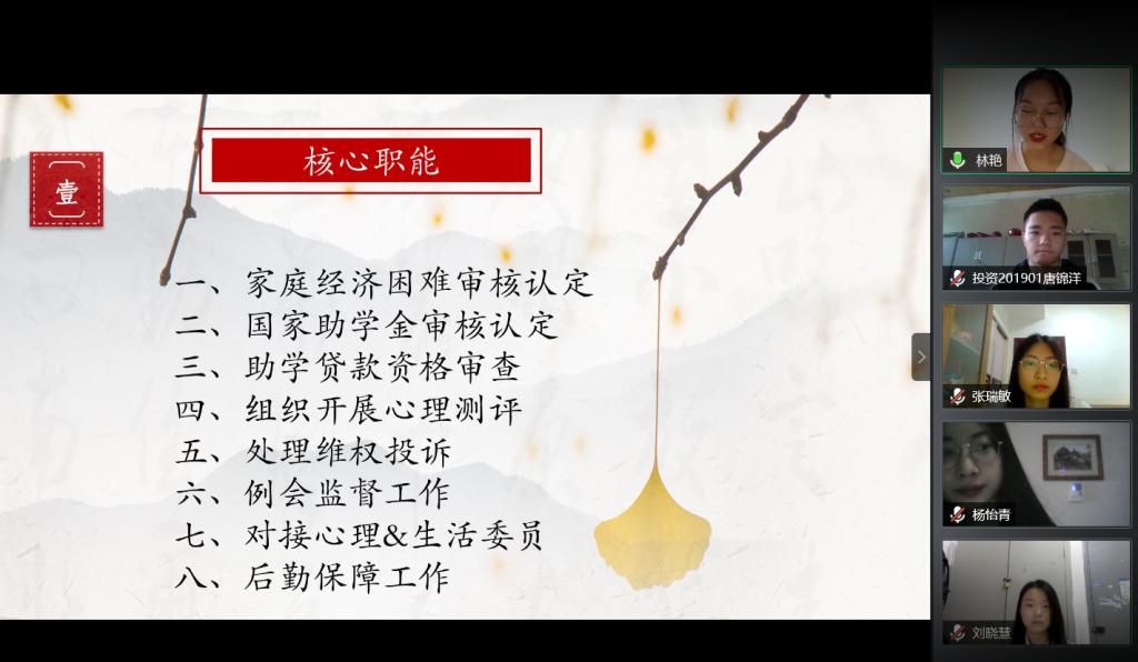 2020年8月16日8:00-21:50,经济学院第六届学生团体联合会主干培训的首场培训会顺利举行。学院全体辅导员和全体主干共计99人参加线上培训,出席会议的还有学院重点扶持的金融投资协会、计量经济协会、商业银行协会、保险协会、模拟联合国协会、演讲与口才协会6个协会。