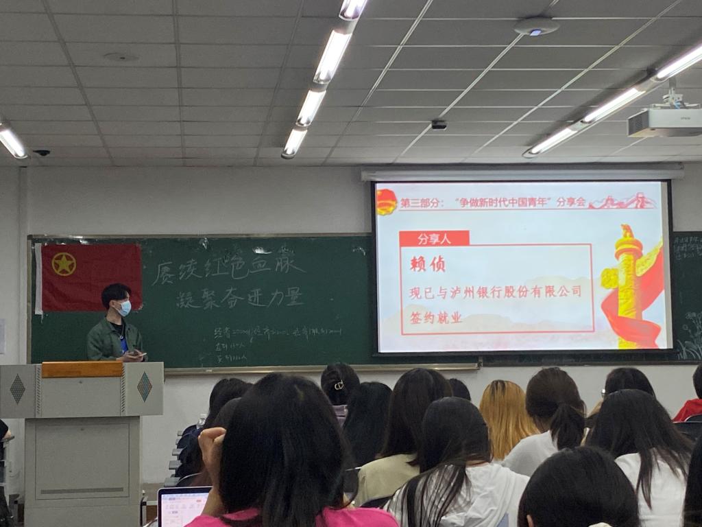 最后是奉文龙与赖侦学长为大家介绍就业方面的相关问题。两位学长现已分别与中铁二局集团有限公司、泸州银行股份有限公司签约就业。两位学长警醒大家:“如果已经明确了就业这条道路,一定要结合自身情况来确定方向,应当选择适合自己的,切忌跟风盲从,要找准定位,擦亮双眼,学会甄别。”大二的我们还有去试错的机会,可以通过寒暑假的实习找到适合自己的岗位,这对于以后的选择也是大有裨益的。