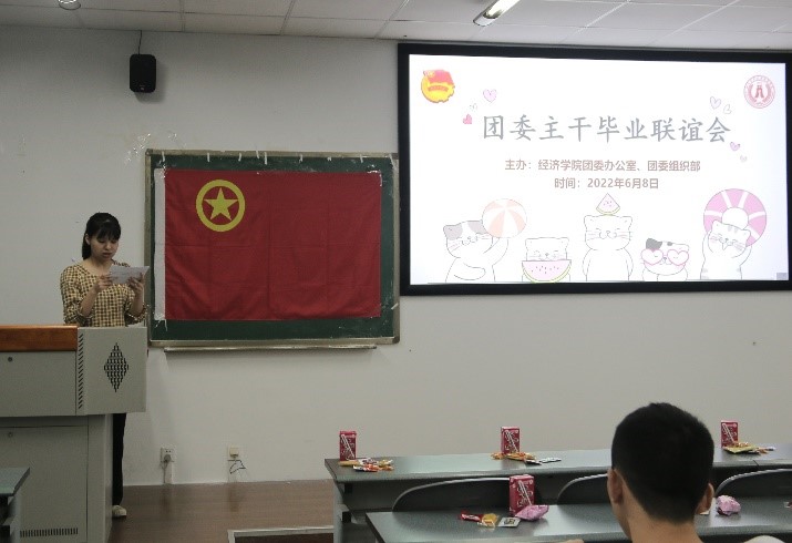 2022年6月8日下午16点整,经济学院团委主干毕业联谊会在4B504顺利举办。这个平凡的夏日因为经济学院团委主干的相聚而变得特别。出席此次联谊的有经济学院18级,19级,20级,21级的各位团委主干,团委所有部门均参加了本次联谊。本次联谊会由第八届团委第一副书记刘爽主持。
