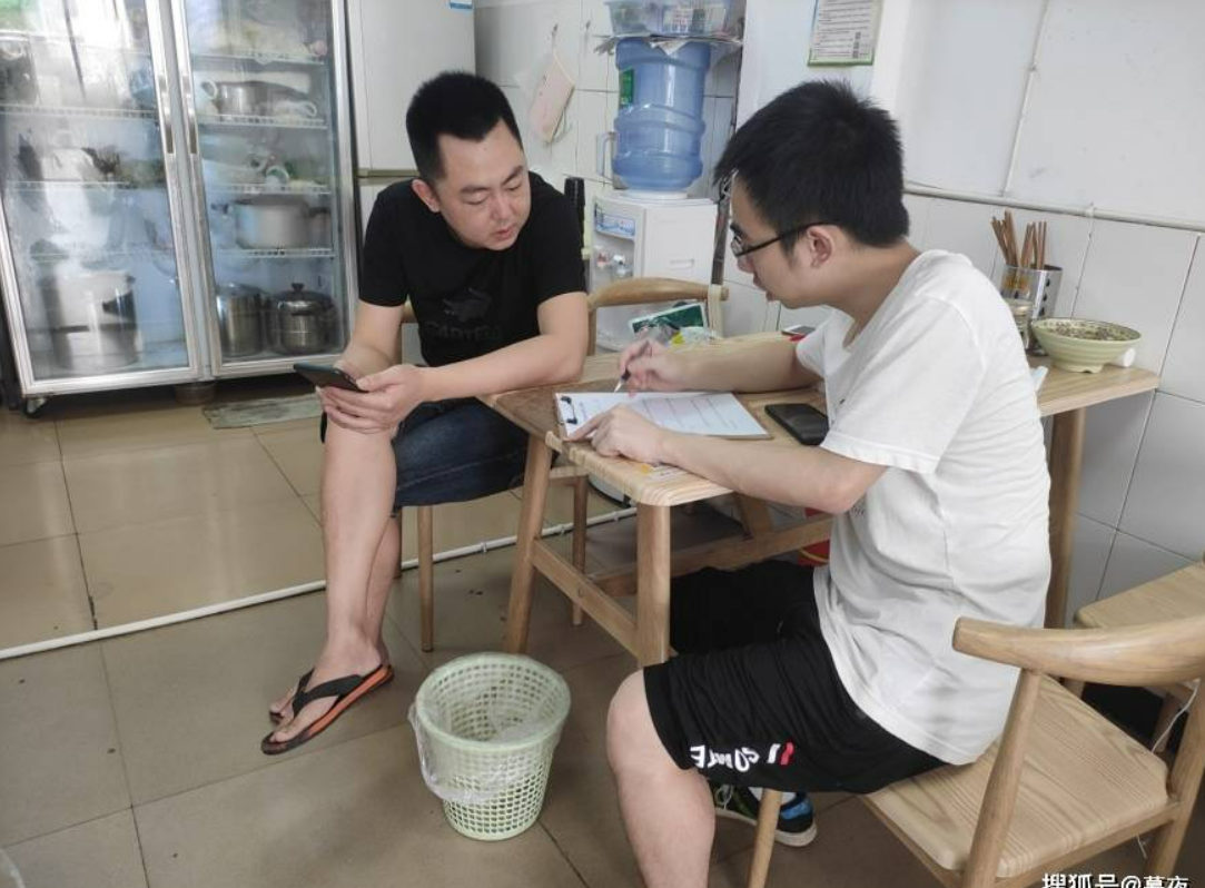图为“外卖绿色联盟”成员在成都市温江区公平街道惠民路对商家周记老麻进行实地调研,问卷访谈