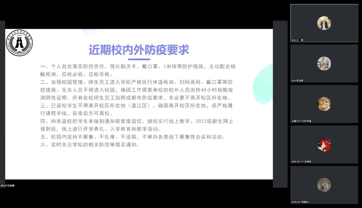 遵守防疫政策,做好线上学习。我院学生会团支部向团员们介绍了疫情防控相关政策以及校内外的防疫要求,并从学习心态、学习计划、学习环境等多个方面进行了线上学习经验的分享。各位团员青年也纷纷表示将坚定支持防疫政策,认真对待线上学习,依据上述分享进一步保证自己线上学习的效果。
