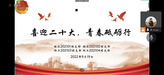 为迎接党的二十大召开,学习宣传好党的十八大以来党和国家事业取得的历史性成就,传播好习近平总书记对青年的关心关爱,团结引领支部团员、青年以昂扬向上的精神风貌建功新时代,以实际行动迎接党的二十大胜利召开,2022年9月19日晚,经济学院经济2101、经济2101团支部联合环院环工2103、环工2104团支部组织召开了以“喜迎二十大,青春砥砺行”为主题的团日活动。