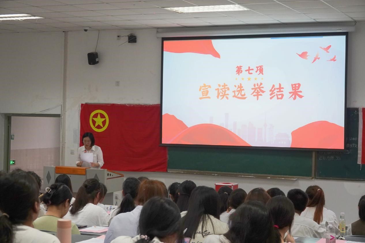 张予萌简要介绍第十届学生团体联合会主席团候选人基本情况,学院学生会秘书长罗利娟老师宣读大会选举办法,学院党委办公室武方琨老师宣读大会监票人、计票人名单。大会听取了第十届学生团体联合会主席团候选人答辩陈述,以公平公正公开的线下无记名投票方式进行现场选举,成功选举产生学院第十届学生团体联合会主席团成员,学院党委办公室主任、团委书记钟贝老师公布选举结果:投资2022级2班郭绪颖当选青年先锋队负责人,金融2022级2班汤立秀、经济2022级1班彭秋婷、经济2022级1班孙艺铭当选团委副书记,金融2022级2班郑严、国贸2022级2班张静、金融2022级4班鲁鑫洁当选学生会主席团成员。