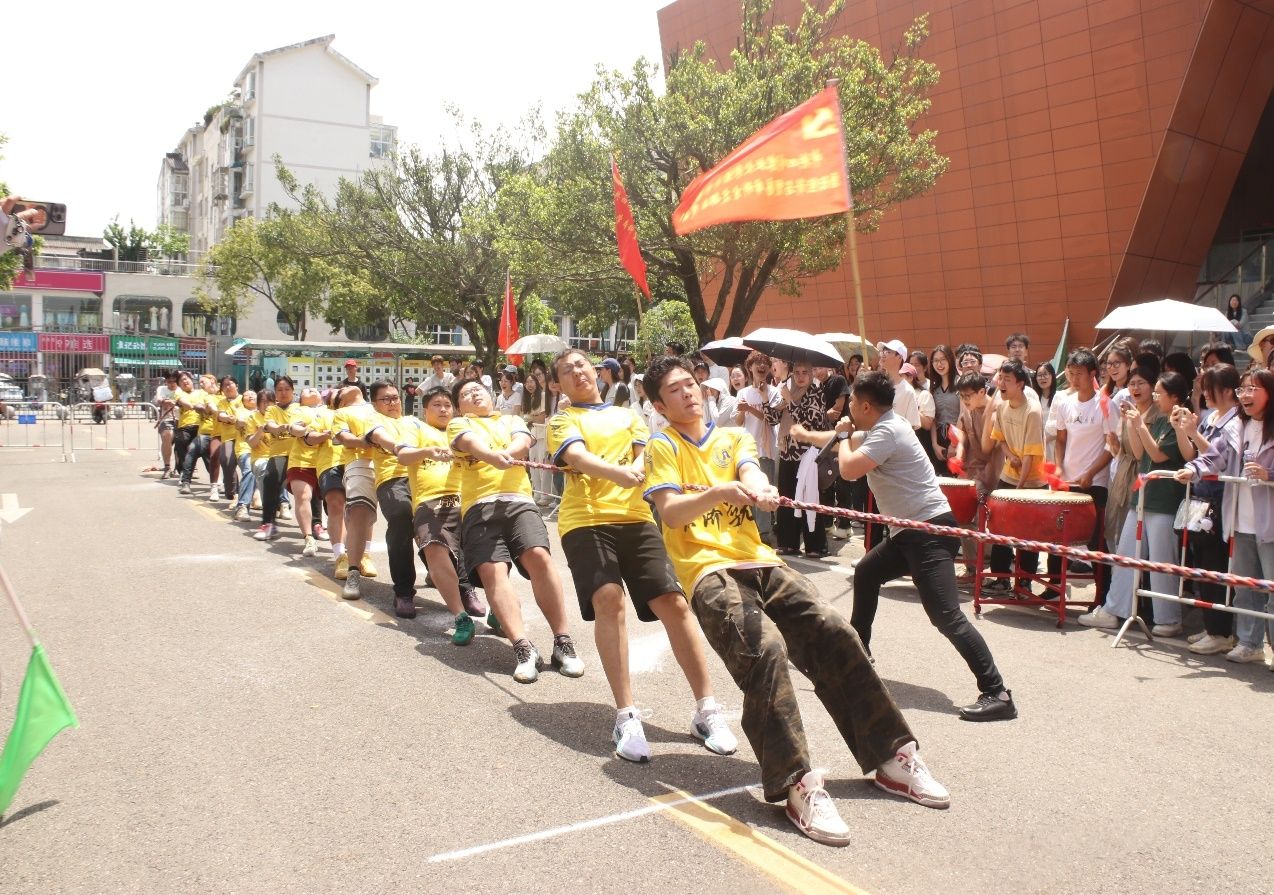 决胜局的局势愈发紧张,观众席上的啦啦队心急如焚,他们奋力擂响战鼓,节奏紧密得如同心跳;整个观众席爆发出排山倒海般的“经院加油”呐喊声,那声音仿佛汇聚了所有人的力量。此刻,我院的队员们面色涨红,豆大的汗珠从额头滚落,他们的双手因紧握发烫的麻绳而微微颤抖,却没有丝毫松懈。在鞋底与地面剧烈的摩擦声中,队员们齐声怒吼,拼尽全身力气发起最后的总攻。随着一声响彻全场的嘶吼,经济学院以雷霆万钧之势,将红标狠狠拽过决胜线,完成了这场惊天逆转,成功登顶!
