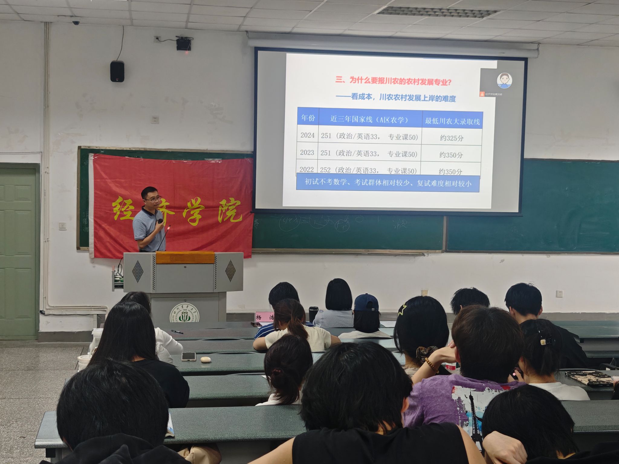 为助力学院学子全面了解我院硕士招生政策、学科特色与备考策略,学院于9月18日下午,在4A109教室举办2025年硕士研究生招生暨升学经验宣讲会。副院长、农村发展(专硕)学科点负责人杨浩教授,金融硕士(专硕)学科点负责人宋坤教授,应用经济学硕士学科点负责人臧敦刚教授,以及2025级金融专硕研究生魏芊珣同学应邀出席并作专题分享。本次宣讲会旨在帮助学院学子全面了解我院硕士招生政策、学科特色与备考策略,是经济学院2025年“研途相伴”升学帮扶系列活动的首场重要活动。