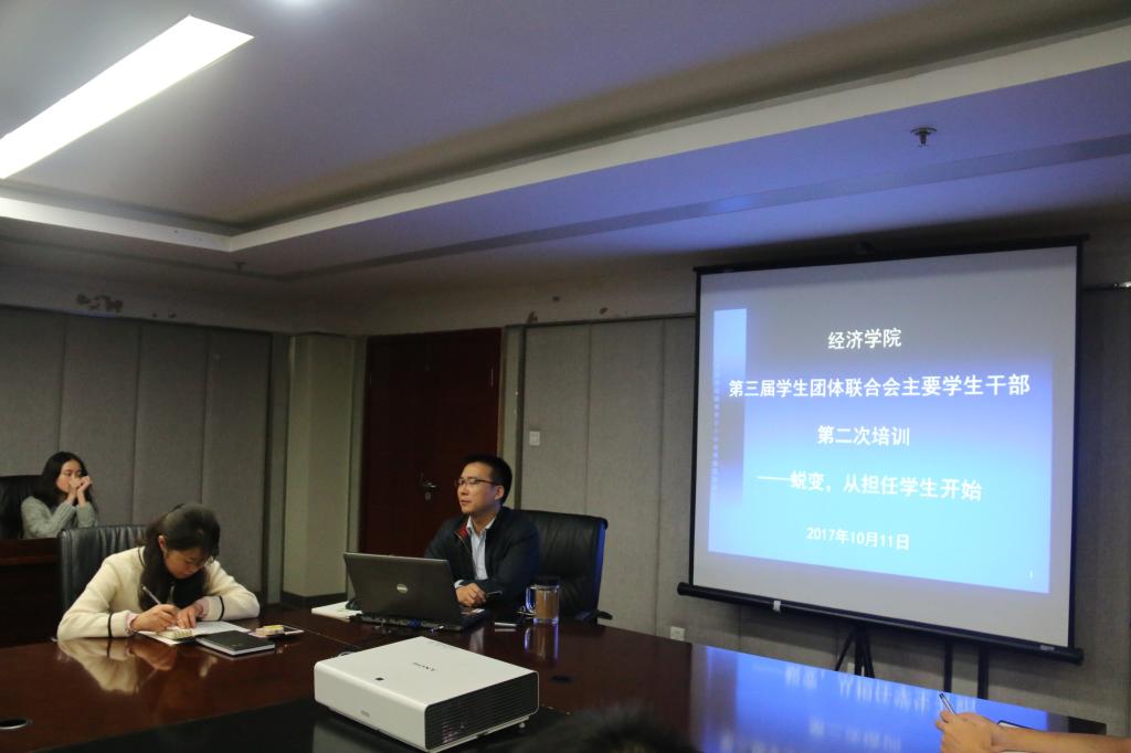 10月11日晚,经济学院在1-408会议室召开2017-2018-1学期第三次学生团体联合会主干培训会,学院党委副书记何仁辉、学院党委办主任蔡丹出席了此次会议,学院学生团体联合会主席团及各骨干到场参加。