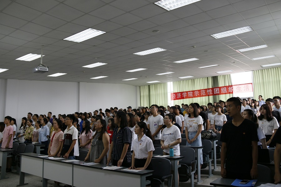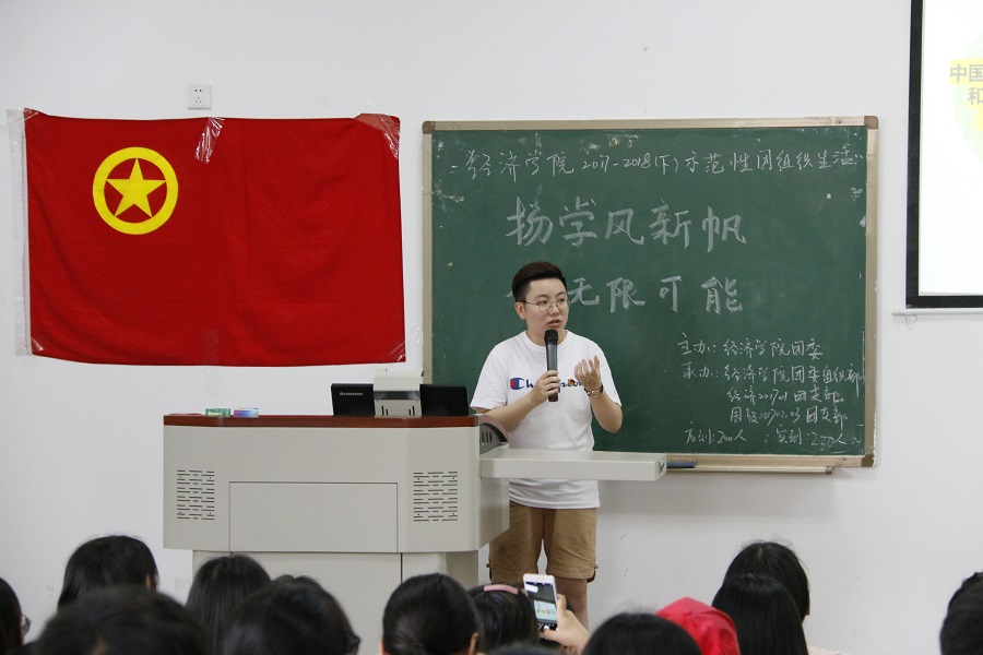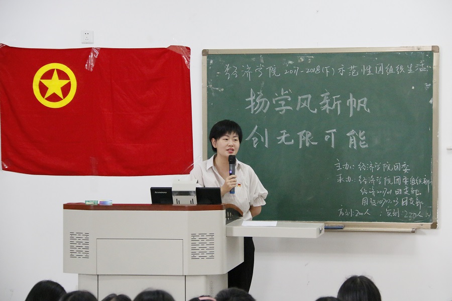 为了构建良好学风,号召大家助力二课成绩单的推行,促进学院同学综合素质的全面发展以及增强团支部号召力、凝聚力,6月26日中午12:30,经济学院2017-2018(下)示范性团组织生活在四教A-306顺利举行。活动主题为“扬学风心帆,创无限可能”,由经济学院团委主办,经济学院团委组织部、经济201701团支部以及国贸1703团支部承办,学院团委书记兼党委办公室副主任钟贝、学委团委副书记邓莲等学生团体联合会干部及2017级各小班团干出席活动。