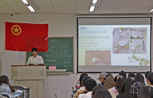 活动开始,在场成员全体起立,齐唱团歌。接下来,学院团委书记钟贝老师分别从资源环境、历史渊源、国家局势三个方面对习近平总书记关于制止餐饮浪费行为的重要指示精神作了深入解读,带领同学们了解厉行节俭、勤俭节约的重要性。