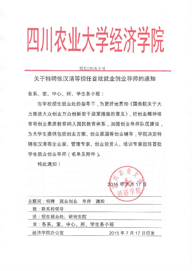 院发【2015】9号 关于特聘张汉清等担任首批就业创业导师的通知