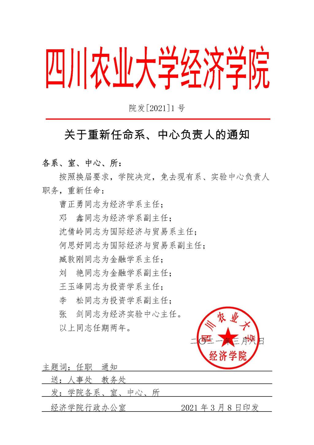 院发【2021】1号 关于重新任命系、中心负责人的通知