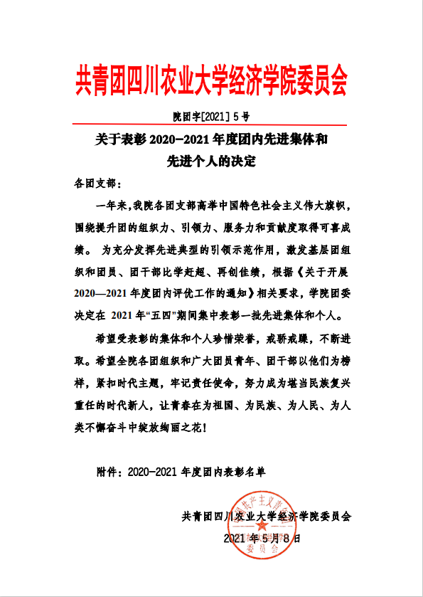 院团字[2021]5号——关于表彰2020-2021年度团内先进集体、先进个人的决定