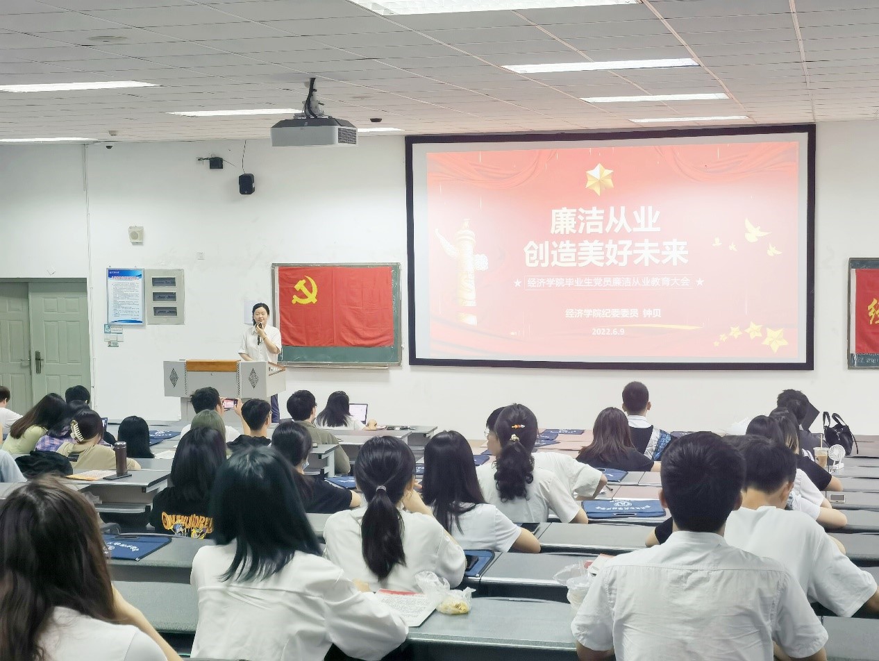 为筑牢毕业生党员廉洁从业思想道德防线,提高毕业生党员拒腐防变和自我保护能力。6月9日,经济学院在4教A202教室召开2022届毕业生党员廉洁从业教育大会。学院党委副书记、纪委书记张翅,学院团委书记兼党委办公室副主任、纪委委员钟贝,以及149名毕业生党员参加大会。