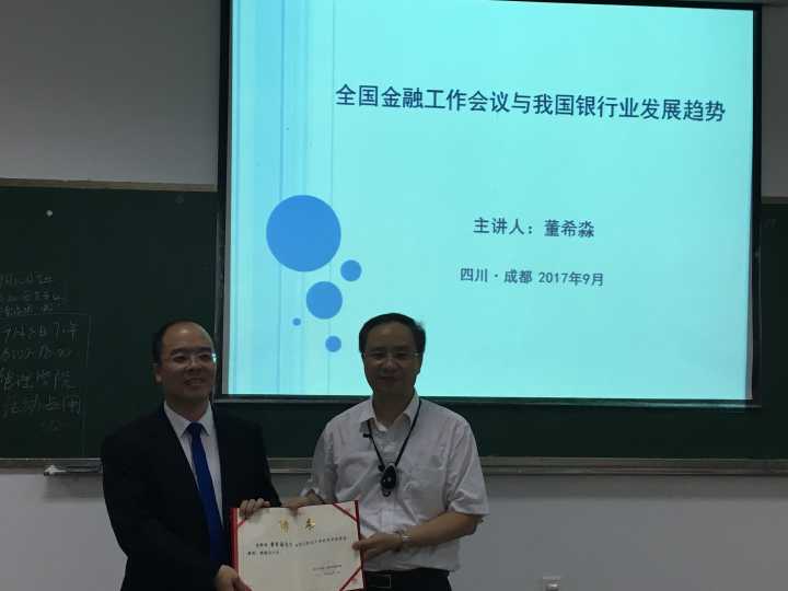 报告前,经济学院院长蒋远胜教授为董希淼颁发了学院客座教授荣誉证书。在报告中,董希淼结合他的研究成果,以第五次全国金融工作会议为背景,围绕当前金融环境和形势、银行业发展的趋势和特点、未来面临的机遇和挑战等方面进行了深刻分析。第五次全国金融工作会议精神的核心是关注金融风险管理,董希淼以“灰犀牛”理论分析了当前我国可能面临的潜在金融风险。他指出第五次全国金融工作会议的召开,实质上是稳定了银行业的发展,带来了新的机遇。银行业创新的动力与源泉是金融科技。银行业正在逐渐向“轻型化、智能化、综合化、规范化、国际化”等特点发展。
