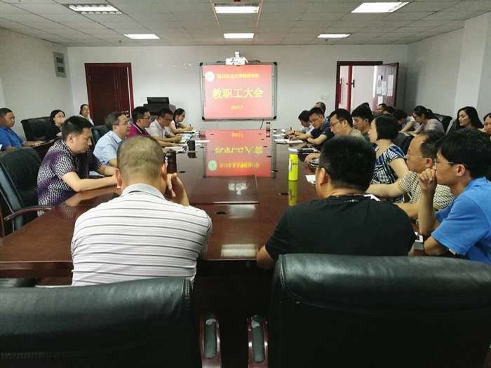 会上,院长蒋远胜全面回顾了学院本学期各项工作,认真分析学院存在的差距与不足。他指出,本学期在师资紧张、教学任务繁重的情况下,全院教职工追求卓越,大胆创新,攻坚克难,本科教学、研究生教育管理、科研工作、国际合作与交流等工作可圈可点。一是本科教学成效显著。各系集思广益,三上三下,全面修订2017版本科人才培养方案;全面总结四年来教学改革成果,获学校教学成果奖特等奖,认真完成省级教学成果奖一等奖的申报。二是科研工作取得新突破。2017年,臧敦刚老师主持的“四省藏区微型金融精准扶贫机制及政策研究”、农村与区域发展专业硕士生导师张海霞老师主持的“四川藏区水电移民可持续生计调查及扶持政策研究”、区域经济学专业硕士生导师赵朋飞老师主持的“西南少数民族地区农村贫困家庭返贫抑制及可持续生计对策研究”分获国家社科基金青年项目资助。西南减贫与发展研究中心主任庄天慧教授主持完成的《同步全面小康进程中四川精准脱贫研究》获四川省第十七次社会科学优秀成果奖一等奖,漆雁斌教授主持的《林业碳汇管理研究》和臧敦刚老师主持的《金融系统性风险与宏观审慎监管研究》分获三等奖。入选学校“双支计划”13人,入选层次和数量明显提高。三是研究生招生圆满完成。今年招收硕士研究生134名,博士生4名,留学生2名。四是学科建设取得阶段性成果。农林经济管理一级学科博士点评估获得优秀。五是国际合作与交流工作稳步推进。顺利开展国际经济与贸易专业中法国际合作办学项目的申报,目前已进入教育部终审阶段。今年国家公派本科生8人,接收法国交换生15人,圆满完成全英文教学、课程实习等工作。蒋远胜强调,在看到成绩的同时需要清醒地认识到存在的差距与不足,本科课堂教学质量、研究生培养质量还有待提高,教职工从事科研的热情与创新动力仍需加强。他号召大家,在今后本科按照专业招生的新形势下,全院上下要积极营造“追求卓越,大胆创新,克服困难,增强学院发展新动能”的良好氛围,明确自身责任与担当,立足学科发展前沿,结合学校特色,提高科研水平;立足学生成长成才,着力围绕本科教学,提高课堂教学质量。