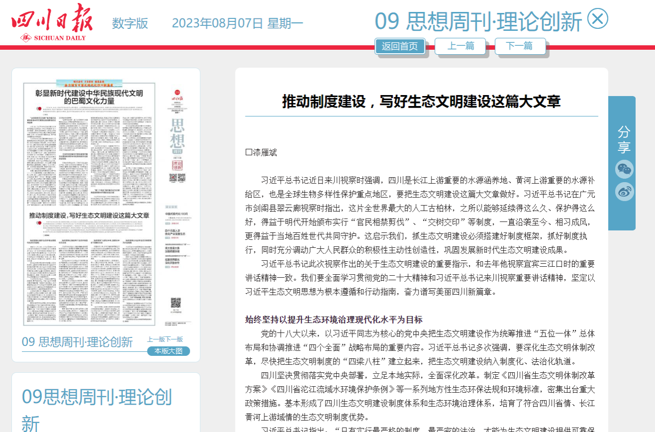 (四川日报)推动制度建设,写好生态文明建设这篇大文章