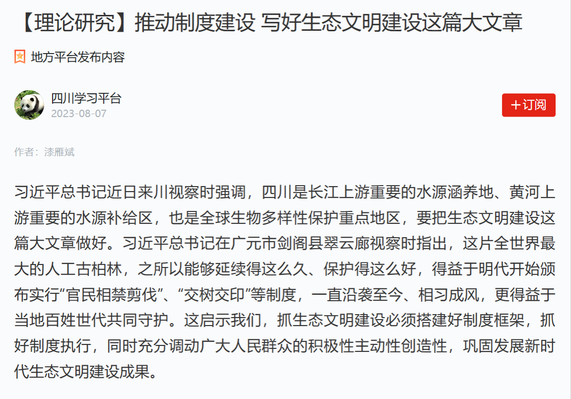 习近平总书记近日来川视察时强调,四川是长江上游重要的水源涵养地、黄河上游重要的水源补给区,也是全球生物多样性保护重点地区,要把生态文明建设这篇大文章做好。习近平总书记在广元市剑阁县翠云廊视察时指出,这片全世界最大的人工古柏林,之所以能够延续得这么久、保护得这么好,得益于明代开始颁布实行“官民相禁剪伐”、“交树交印”等制度,一直沿袭至今、相习成风,更得益于当地百姓世代共同守护。这启示我们,抓生态文明建设必须搭建好制度框架,抓好制度执行,同时充分调动广大人民群众的积极性主动性创造性,巩固发展新时代生态文明建设成果。