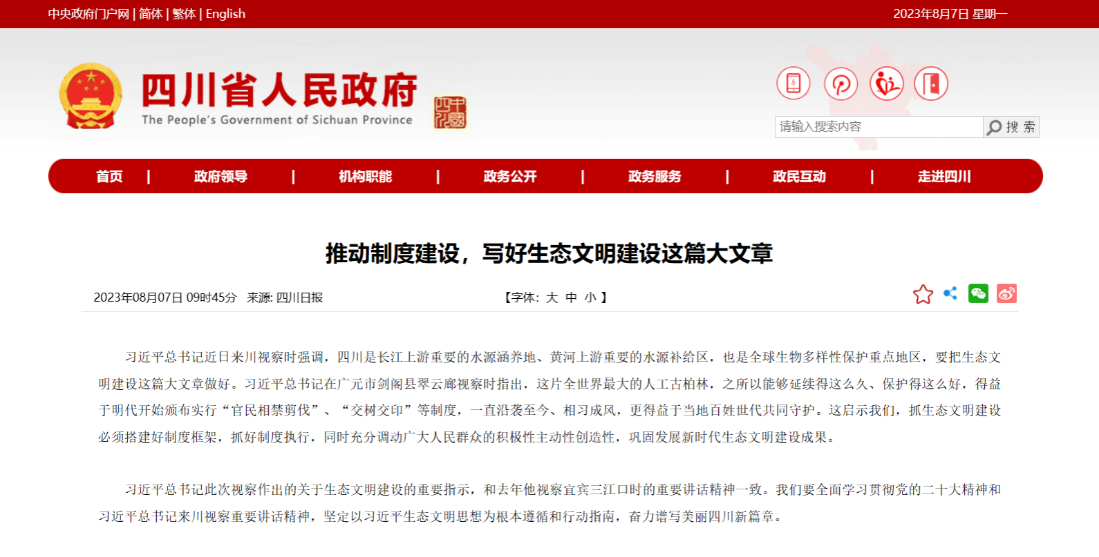 (四川省人民政府网站)推动制度建设,写好生态文明建设这篇大文章