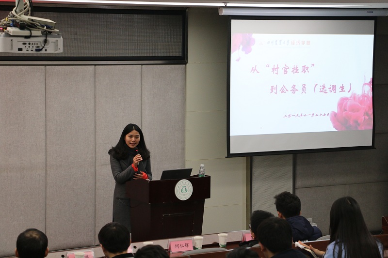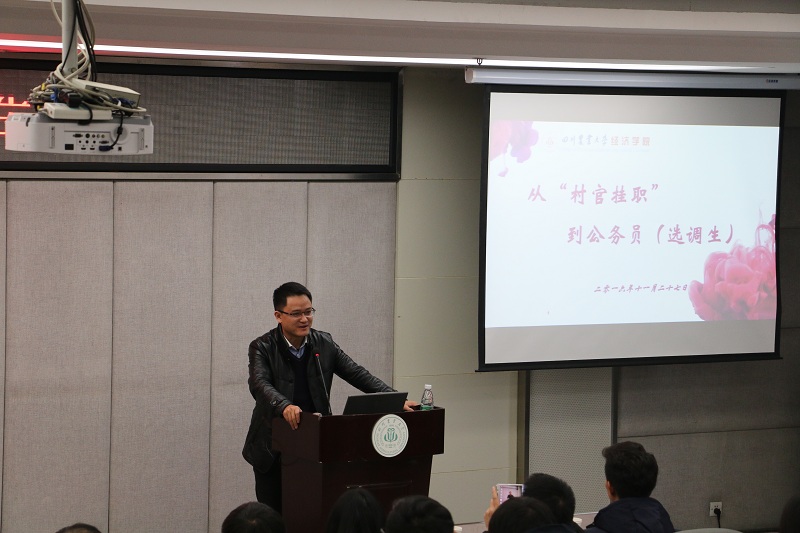 我校农学2011级校友,现任成都市(温江区)“一村一大”的雷娟,向大家分享了她的“村大”感悟,鼓励大家加强学习锻炼,培养自己的沟通与协调能力。毕业于西南财经大学,曾任成都市(温江区)“一村一大”,现已考取公务员的王琦璐向大家讲述了他的“村大”经历,并分享了他从“村大”考取公务员的经历,鼓励同学们在“村大”的岗位上要多观察、多锻炼,积累经验,再报考公务员就很有优势,对工作也很有帮助。