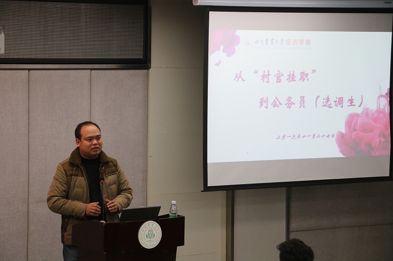 我校农经2005级校友谢亮,也是原经济管理学院第一届“百名大学生‘村官’挂职锻炼”暑期社会实践团队队员,在校期间曾多次参加过“村官挂职”,毕业时也被选拔为四川省选调生,现就职于遂宁市财政局。他结合自身经历,向大家分享了从 “村官挂职”到公务员一路走来的历程,并鼓励大家多走入基层,参与实践锻炼。
