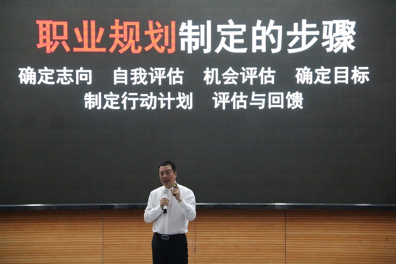 “亲爱的同学们,我刚从贵州遵义飞回成都,是从机场赶过来的,现在还发着烧,做完这场报告,明天一早我又将飞回贵州。但是作为一名互联网+创业导师,从事的是公益项目,我责无旁贷”孟连尉先生一出场就牢牢地抓住了听众的心,全场顿时响起了雷鸣般的掌声。随后,孟连尉先生围绕“为什么要开展职业生涯规划、大学生该如何进行职业规划”这两方面展开了翔实而又生动的讲解。他开宗明义的告诉同学们职业规划的目的就是充分提升个人职业竞争力,实现自主就业,职业规划的基本原则就是要择己所爱、择己所长、择世所需、择己所利;他从“可行性、适时性、适应性、持续性”几个方面分析了职业规划的特性,介绍了个人因素、组织因素、社会因素对职业规划的影响,鼓励同学们从“进取型、安全型、自由型、攀登型、平衡型”等类型中找到适合自己的成功方向;他重点介绍了职业规划制定的步骤,即:确定志向、自我评估、机会评估、确定目标、制定行动计划到评估与回馈。