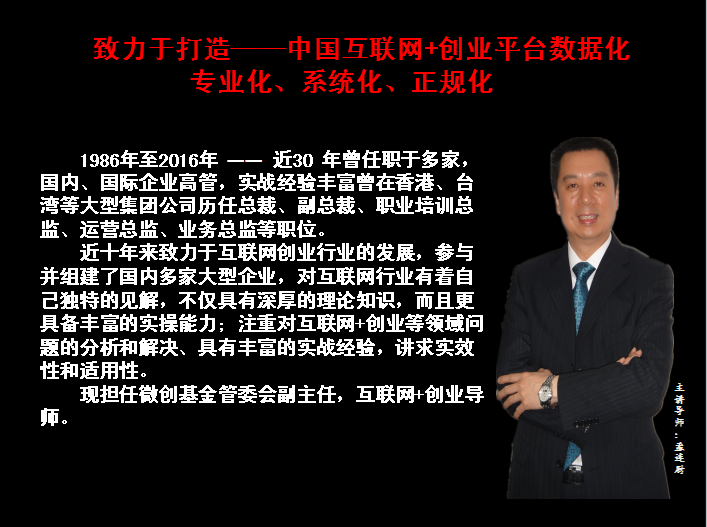 嘉宾简介:孟连尉,1986年至2016年——近30年曾任职多家国内、国际企业高管,实战经验丰富,曾在香港、台湾等大型集团公司历任总裁、副总裁、职业培训总监、运营总监、业务总监等职位。近十年来致力于互联网创业行业的发展,参与兵组建了国内多家大型企业,对互联网行业有着自己独特的见解,不仅具有深厚的理论知识,而且更具备丰富的实操能力;注重对互联网+创业等领域问题的分析解决、具有丰富的实战经验,讲求实效性和适应性。现任微创基金管委会副主任,互联网+创业导师。
