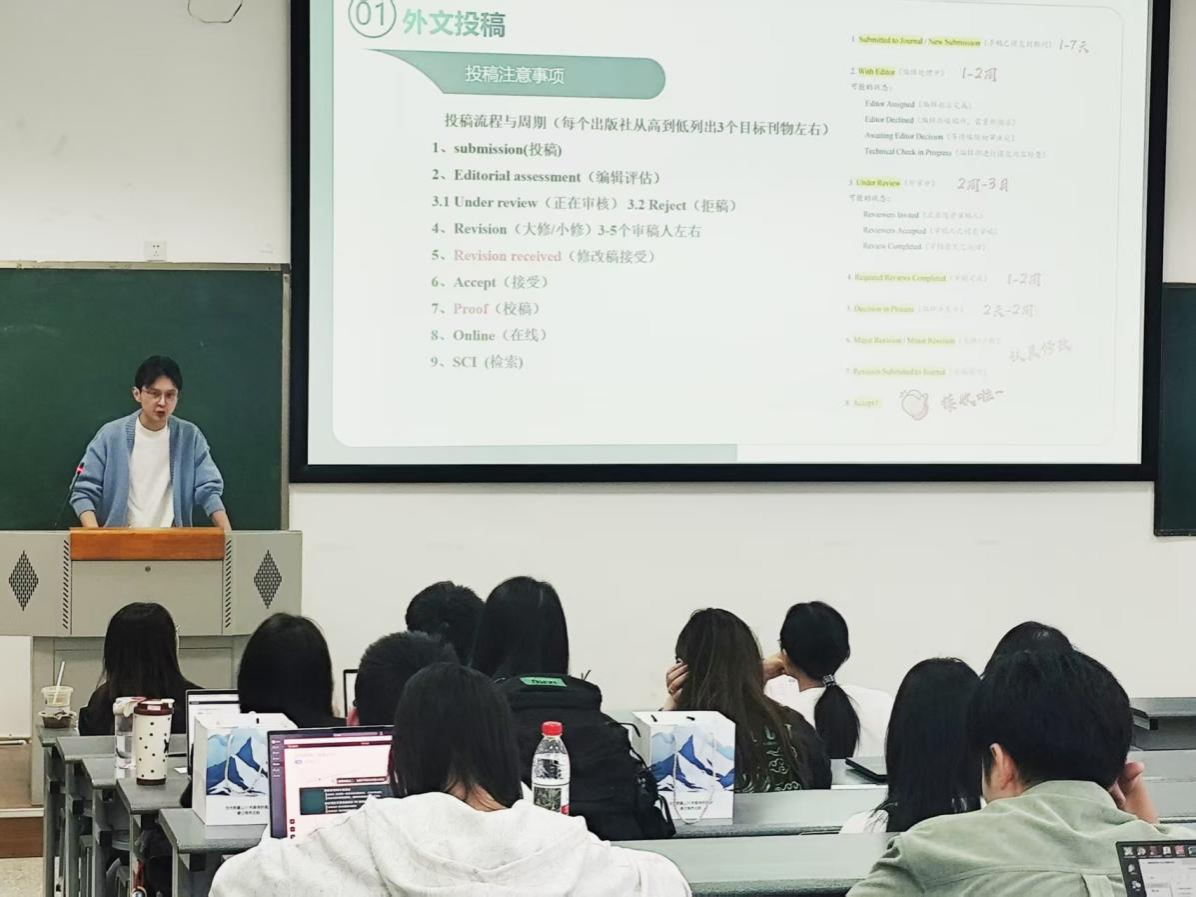 4月17日下午,我院研究生会主办的“笔耕不辍,学术共进”论文写作学术沙龙在四教A区306成功举办。活动邀请国家奖学金获得者张洪瑞、一等学业奖学金获得者杨鞭分享,针对研究生群体在论文选题与投稿流程方面普遍存在的困惑,开展精准帮扶指导。活动吸引了百余名本硕学生参与,为学子们呈现了一场“干货”满满的学术赋能盛宴。