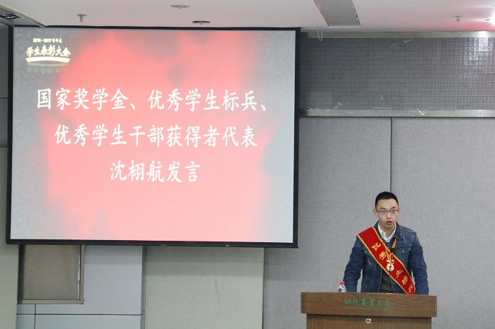 “经济学院这个大家庭教会了我们满怀期待,教会了我们心存敬畏,更教会了我们追求卓越”。“优秀学生标兵”、“国家奖学金”、“优秀学生干部”获得者,来自经济2014级2班的沈栩航讲述了促使他成长成才的三大法宝:“感恩、责任、未来”。