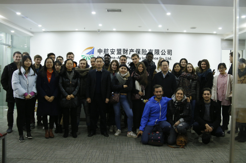 12月6日,经济学院“中国商务拓展”项目的26名法国交换生在国贸系主任沈倩岭副教授的带领下赴学院实践基地——中航安盟财产保险有限公司和老外Here两家外资公司进行参观交流。