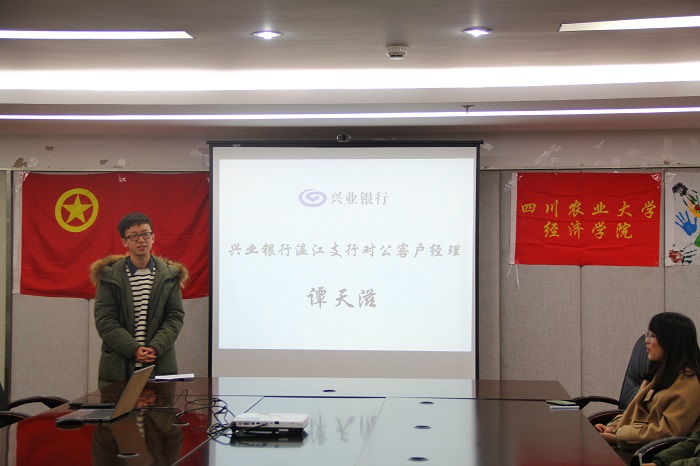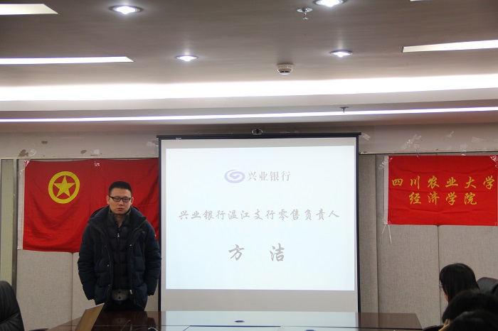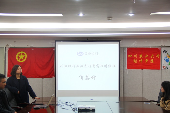 12月21日,经济学院在1教408会议室举办兴业银行专场实习交流会。兴业银行温江分行零售负责人方洁、贵宾理财经理蔺蕊竹、对公客户经理谭天滋、贵宾理财师刘芊莅受邀莅临座谈会。学院党委副书记何仁辉、团委书记兼党委办公室副主任钟贝和对兴业银行有从业志向的同学参加会议。
