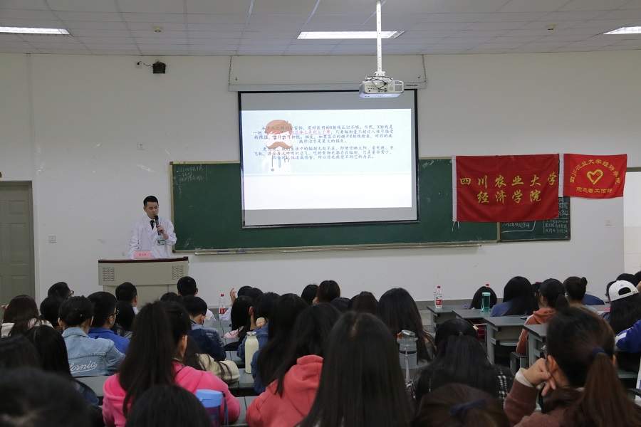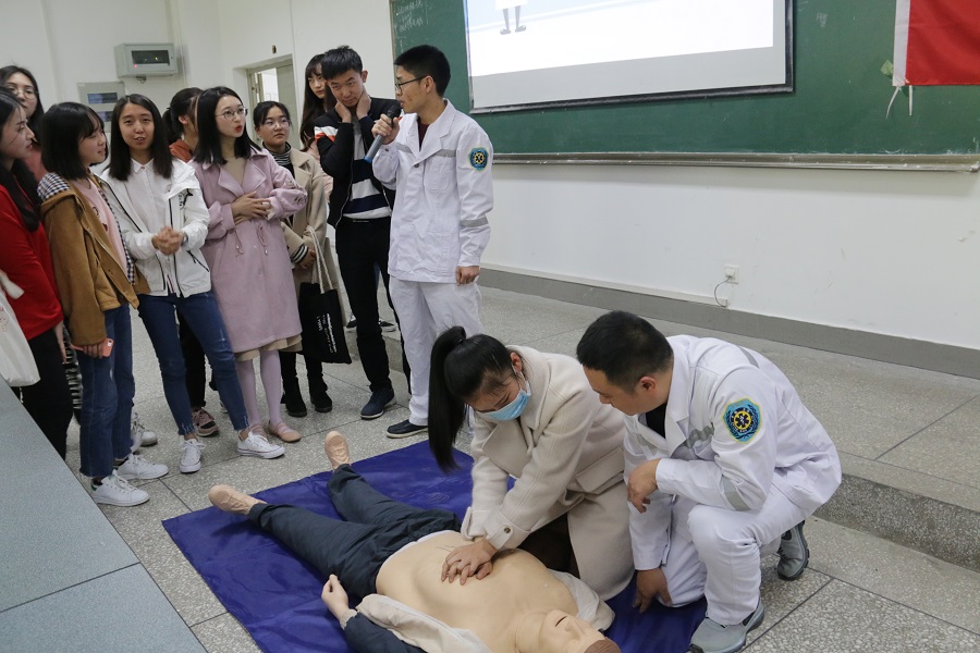 3月22日中午,成都市第五人民医院日间病房主治医师黄强、放射科医师龙义添、急救科专科护士杨涛一行12名医护人员为我校经济学院师生进行校运会应急救护知识培训。经济学第39届校运会筹委会、全体参训的教练、运动员和后勤医护人员200余人聆听了培训。