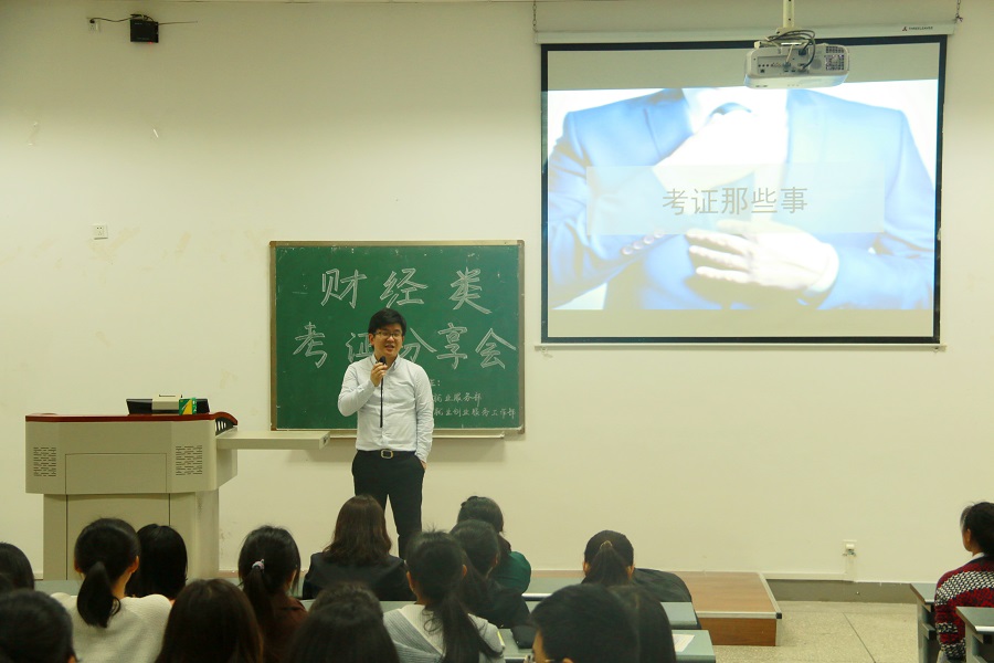 为促进学风建设,提升就业质量。3月28日晚,经济学院联合管理学院在第4教学楼a-206教室举办财经类考证分享会。两学院邀请中级经济师、黄金交易师,中博教育的职业生涯规划讲师皮佳伟莅临现场交流分享,吸引了校区百余名同学到场聆听。