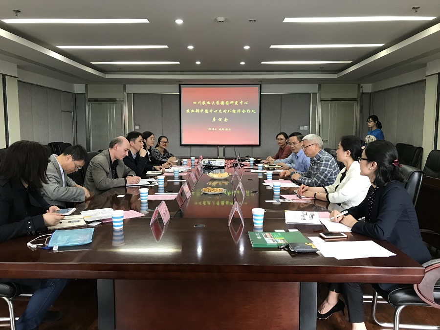 4月12日下午,农业部中德农业中心德方主任Ritter Jurgen Alois博士、农业部对外经济合作中心欧洲处处长唐治韶、四川省农业厅国合处调研员高世林等一行莅临我校德国研究中心(以下简称中心),并就中德农业合作事宜等展开洽谈。tyc41183太阳成集团学副校长、中心主任吴德,经济学院院长、中心常务副主任蒋远胜,校国合处副处长、中心副主任夏新蓉、经济学院副院长吴平等参加会议。