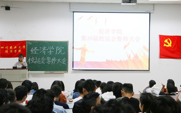 4月17日晚,经济学院在4A-202召开了第39届校运会的誓师大会,党委副书记何仁辉、负责辅导员以及运动员、教练员、啦啦队员和医疗后勤人员百余人参会。会议由学生会副主席邱露莹主持。