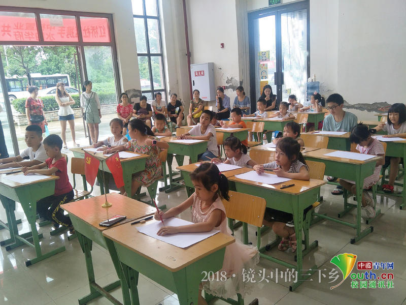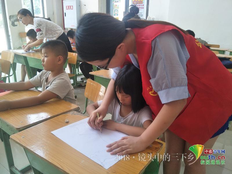 图为村官挂职成员指导小朋友绘画。中国青年网通讯员 陈逸 摄