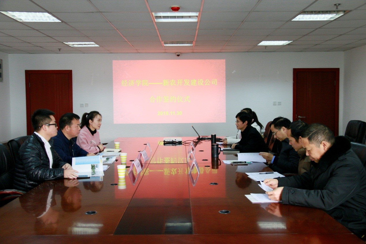 11月30日上午,学院与邛崃新农开发建设公司战略合作签约仪式在1教403举行,新农开发建设公司董事长李长荣、副总经理郭玲利、企业发展部杨富强,经济学院院长蒋远胜、投资学系主任王玉峰、投资学系部分老师参加签约仪式。