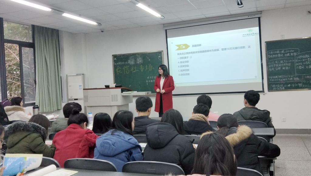 邹老师通过向同学们介绍农信社的发展历程、招考岗位和薪酬待遇等,让大家初识农信社;通过解读四川农信社历年招考政策和特点等,为大家解密农信社;通过援引历年招考真题,讲解农信社笔试、面试重难点,指导大家征服农信社。讲座过程中,“什么是风险管理?”“哪部法律是银行经常会用到的?”“银行业务主要分为哪些方面?”等专业问题不时被抛出。同学们热情高涨,踊跃作答,现场气氛热烈。