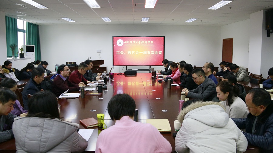 1月3日上午,学院第一届工会、教代会第五次会议在7教1309会议室召开。院长蒋远胜,党委书记漆雁斌,党委副书记、纪委书记、工会主席何仁辉,副院长吴平,教代会主席兼工会副主席李阳明,以及50位教师代表参加了会议,会议由何仁辉主持。