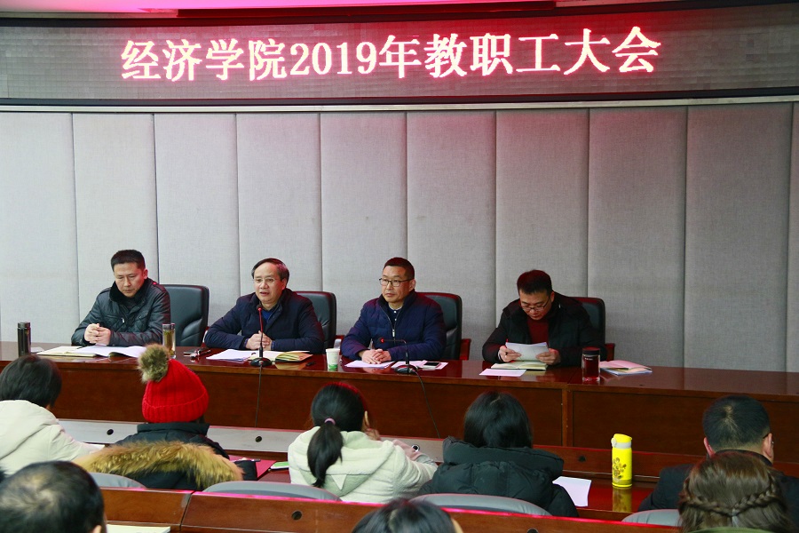 蒋远胜指出,今年是新中国成立70周年,也是全面建成小康社会、实现第一个百年奋斗目标的关键之年,是深入贯彻落实全国全省教育大会精神的开局之年,面临“乡村振兴战略”、高考招生制度改革、十三五规划的攻坚克难和学校学科建设年的新机遇新挑战,经济学院的发展优势有三点:一是团结一心、奋发有为的学院文化和氛围;二是受到学生和家长喜欢以及社会认可的本科专业;三是走在学校前端的国际化办学。同时,学院还存在师资队伍不够壮大、专任教师队伍年龄结构失衡、学科建设需要进一步加强等短板。全院教职工必须踏平坎坷成大道,斗罢艰险又出发,谋事创业,真抓实干,推动经济学院各项事业再上新台阶。